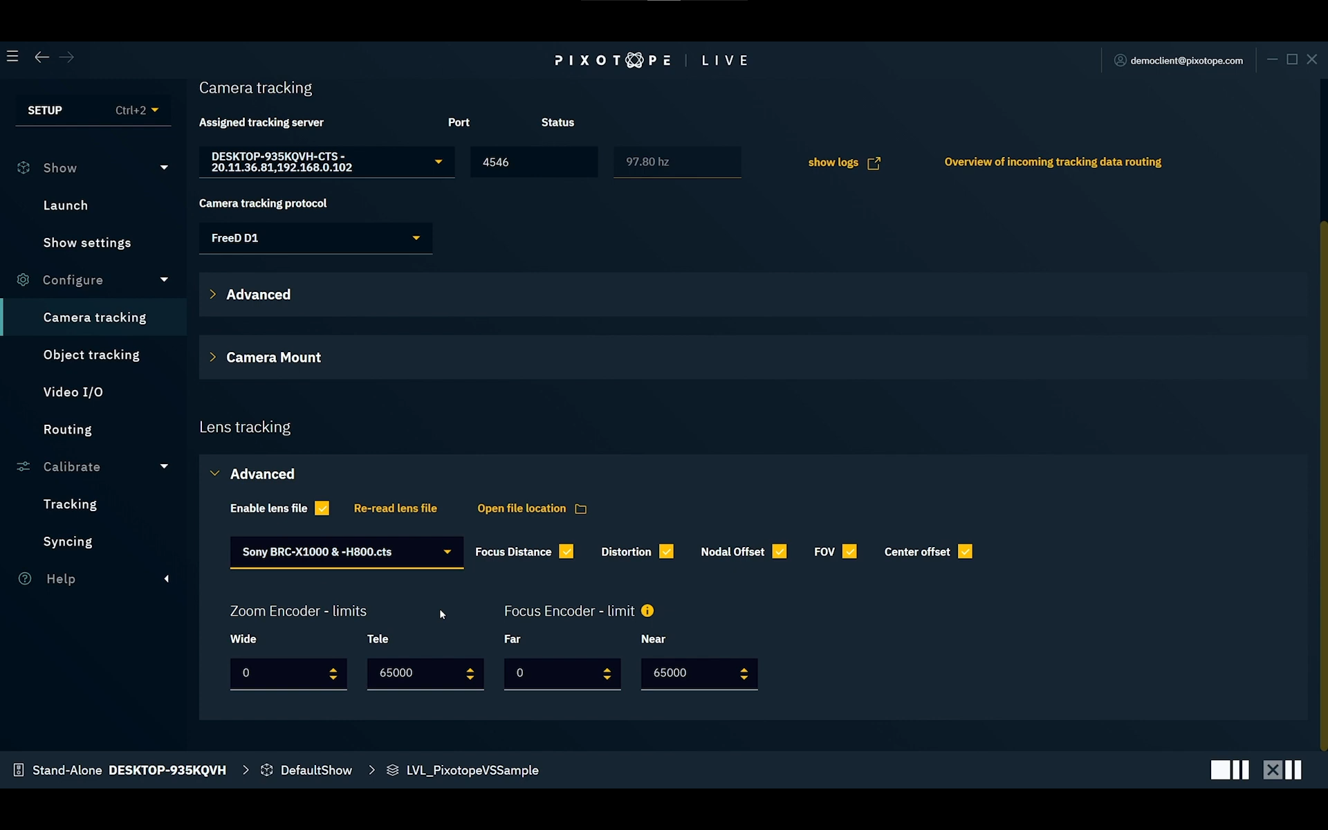 Open the Setup view in Pixotope Director. Go to Camera tracking > Lens tracking and open the Advanced section. Click on Enable lens file and then on Open file location.