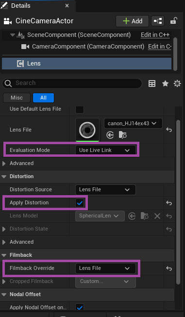 You can now drag and drop the lens asset in the "Lens File" slot. In addition to this, you need to activate "Apply Distortion" and override the filmback with that of the lens file, as shown below: