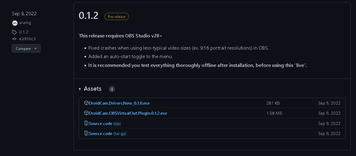 This brings you to the releases page of the project on Github. Download both "DroidCam.Drivers.New_0.1.0.exe" and "DroidCam.OBSVirtualOut.Plugin_0.1.2.exe". The former creates a driver for Windows for the virtual webcam and the latter is an installer for the OBS plugin.