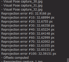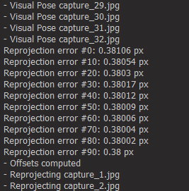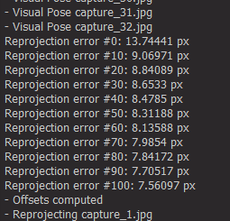 Before the calibration is even completely finished, EZlineup prints to the console the average pixel reprojection error accross all images: